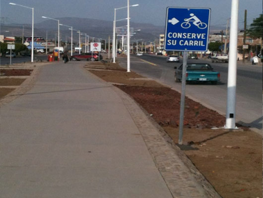 Construction of 6.5 km of bike lane with anchored fittings and hydraulic concrete pavement of 8 cm. of thickness, installation of led signaling system and traffic controllers, placement of thermoplastic paint, vertical signage, installation of public lighting with led luminaires of 129 Watts.